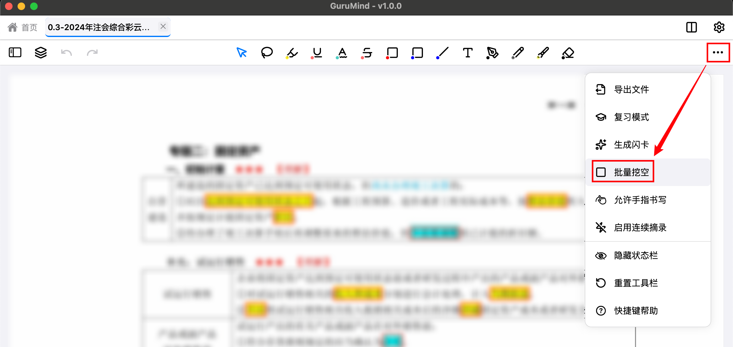 批量挖空功能可以自动识别 PDF 中已有的高亮区域和彩色文字标记,将它们转换为 PDF 批注,从而可以在复习模式中使用或导出为 Anki 卡片。这对于扫描版教材、标注过的讲义等场景特别有用。