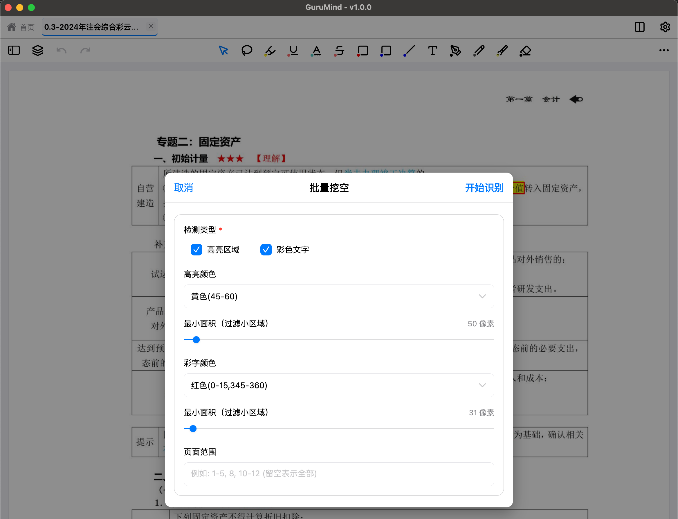 批量挖空是一个智能识别工具,专门用于处理已经包含高亮或彩色标记的 PDF 文档(如扫描版教材、标注过的讲义等)。它能够: